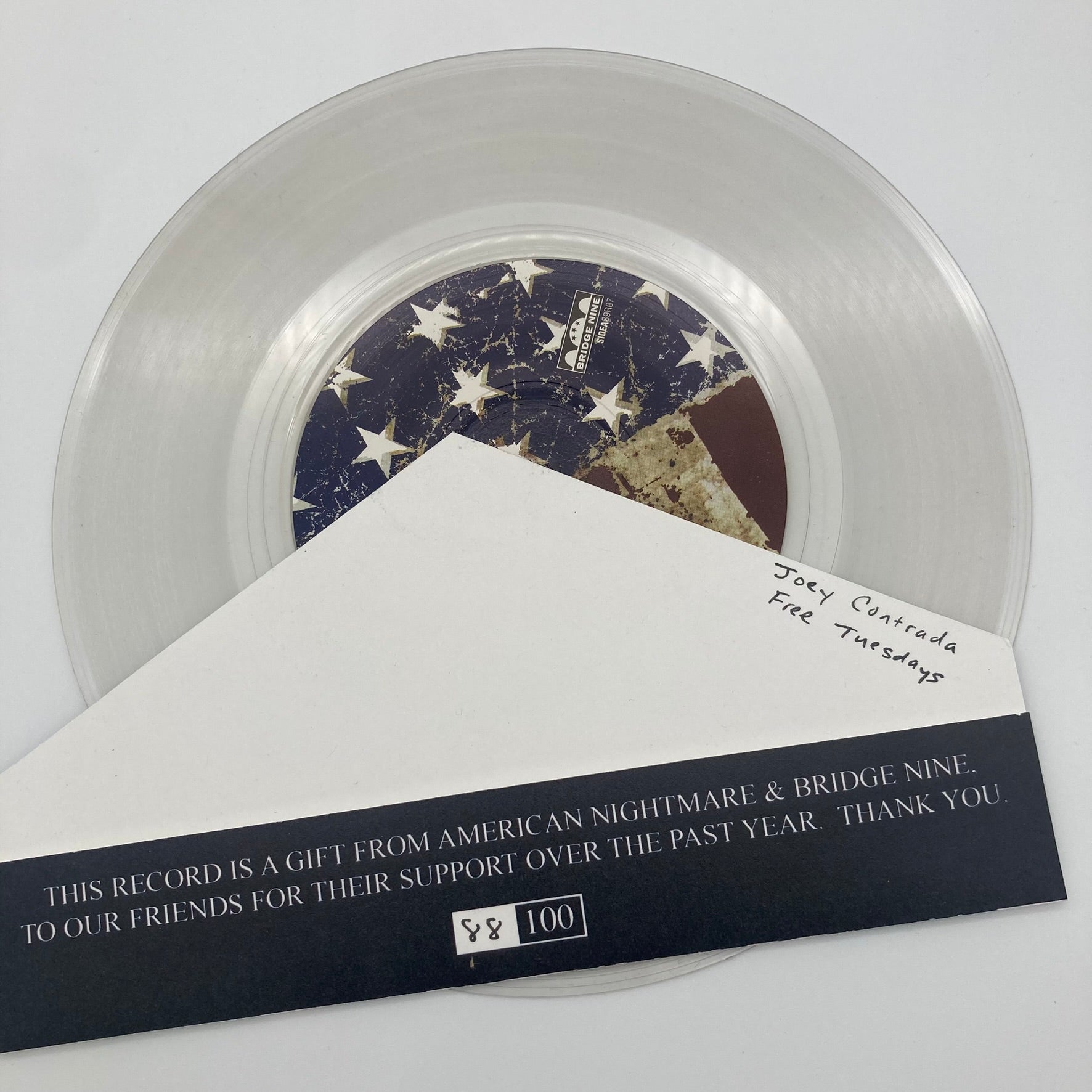 Alright, global HxC collector nerds. This is the "friends" version on clear vinyl, limited to 100. Ours is no 88/100. Its dedicated to "Joey Contrada, Free Thursdays" on the backside. J. Contrada was a member of INVASION, STOP AND THINK and RIGHTEOUS JAMS (at least thats what discogs suggests) and he's probably who sold this record to our friend Thomas. Vinyl and inner sleeve are like new, the plastic wrapping is in OK condition given the age.